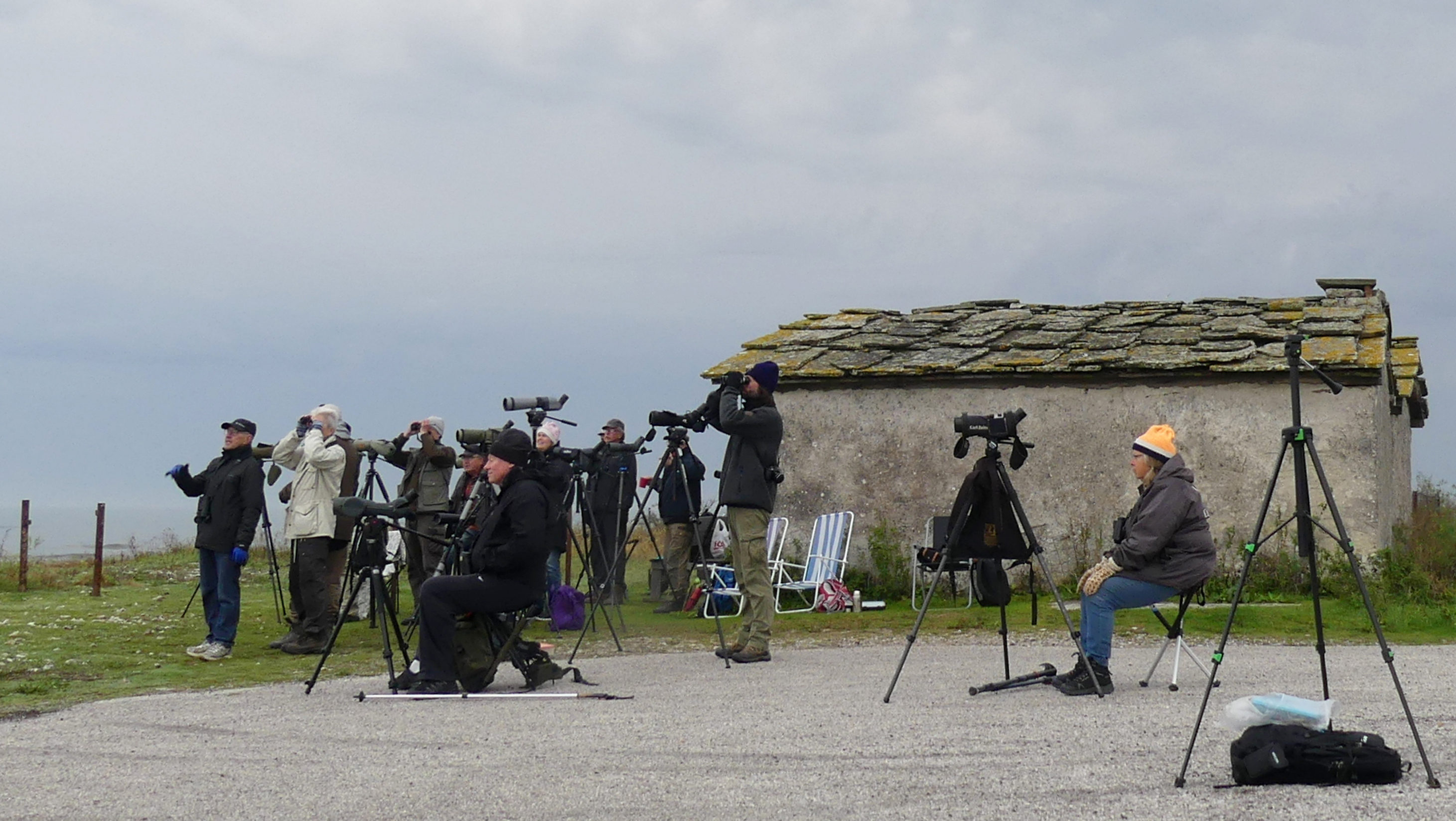 Som så ofta var väderprognosen för denna dag vacklande mellan fint väder eller ”bus med regn”. Trots denna ovisshet om dagens utgång hade glädjande nog nitton personer samlats på Gotlands sydöstra hörn för att få lite ”smak av sjöfågelsträck”. Inget gör undertecknad mer glad än när medskådare vill dela upplevelsen som fåglarna ger. En bit innanför udden låg en tämligen rejäl dimma men ute vid bodarna var sikten god, vinden svag och luften torr. Det där med svag vind skvallrar tyvärr om ett måttligt intresse hos fåglarna att sträcka söderut, men vi fick ändå smakprov på de flesta sorter man bör se. Strax efter att vi startat spanandet drog en pilgrimsfalk ut över udden för att försöka få lite frukost. Faludden är en säker lokal för denna art som ofta kan ses även under vintern härute. Små flockar med sjöorrar från tajgan och tundran drog förbi i långa ”bläckpunktslinjer” med en ”plupp” i spetsen. Den andra typiska arktisemigranten, prutgåsen, visade upp sig fint i några små gäng. Flera gick nära och fint utanför stranden och tack vare den svaga vinden hördes det underbara, knorrande småpratet fåglarna emellan.