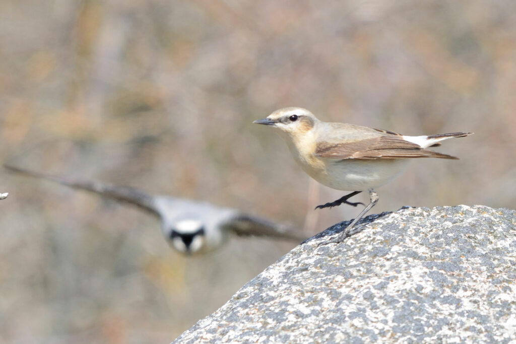 Nu gick färden vidare längs västra sidan ner mot sydspetsen. Innanför hällarna stannade vi för en behövlig fikarast kombinerad med skådning. Så småningom gick vandringen ner till gamla mistluren där vi kunde studera en fin småspov som behagade stå still tillräckligt länge för att skillnaden mot den större kusinen kunde beskrivas. Kentska tärnor kunde också noteras. Vi vände nu norrut och gick upp genom den vackert betesformade ”Rivethagen”. I lä bakom västra muren var det moln med små flygfän som lockade en del tättingar. I norra delen gick en fin flock med elva småspovar som dock var lite blygare än den vi såg nere vid sjön. På vägen upp till parkeringen tyckte undertecknad att enda minuset i protokollet var avsaknaden av rovfåglar, men just då for en tornfalk förbi över fälten öster om klippan. Tyvärr gick det väl fort för att kunna avnjutas men gruppen verkade ändå nöjda med dagens utflykt. Ledde det hela gjorde